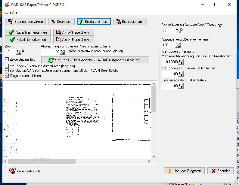 Scannen Sie eine Zeichnung ein oder laden Sie eine Bilddatei von der Festplatte. Das Programm versucht dann die Linien von erkennen und als DXF Datei zu speichern. Die Version 2.0 erzeugt immer zusammenhängende Polylines.